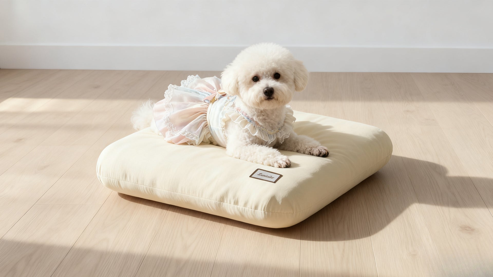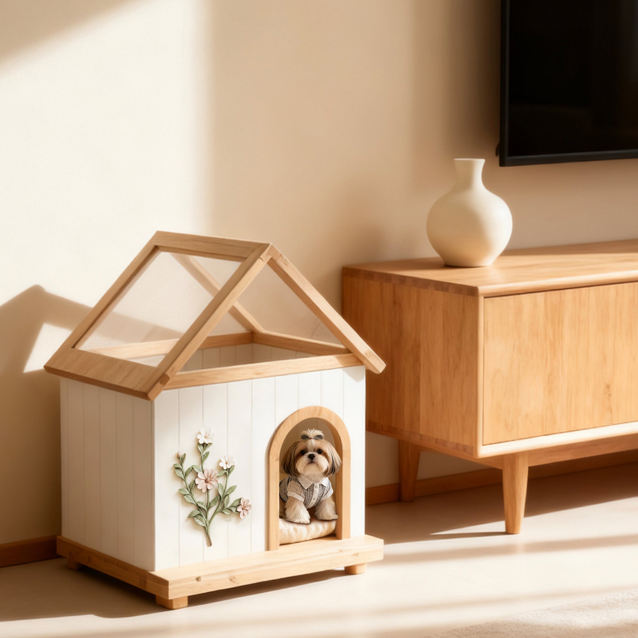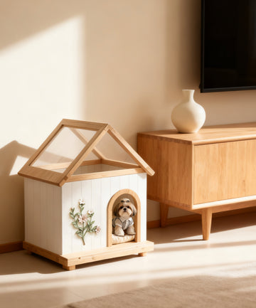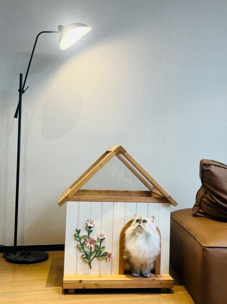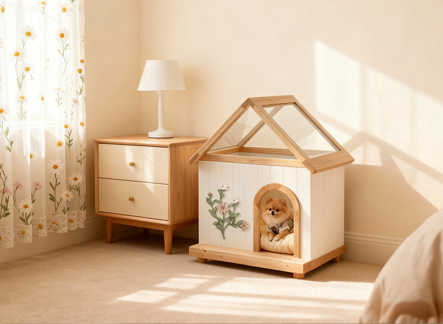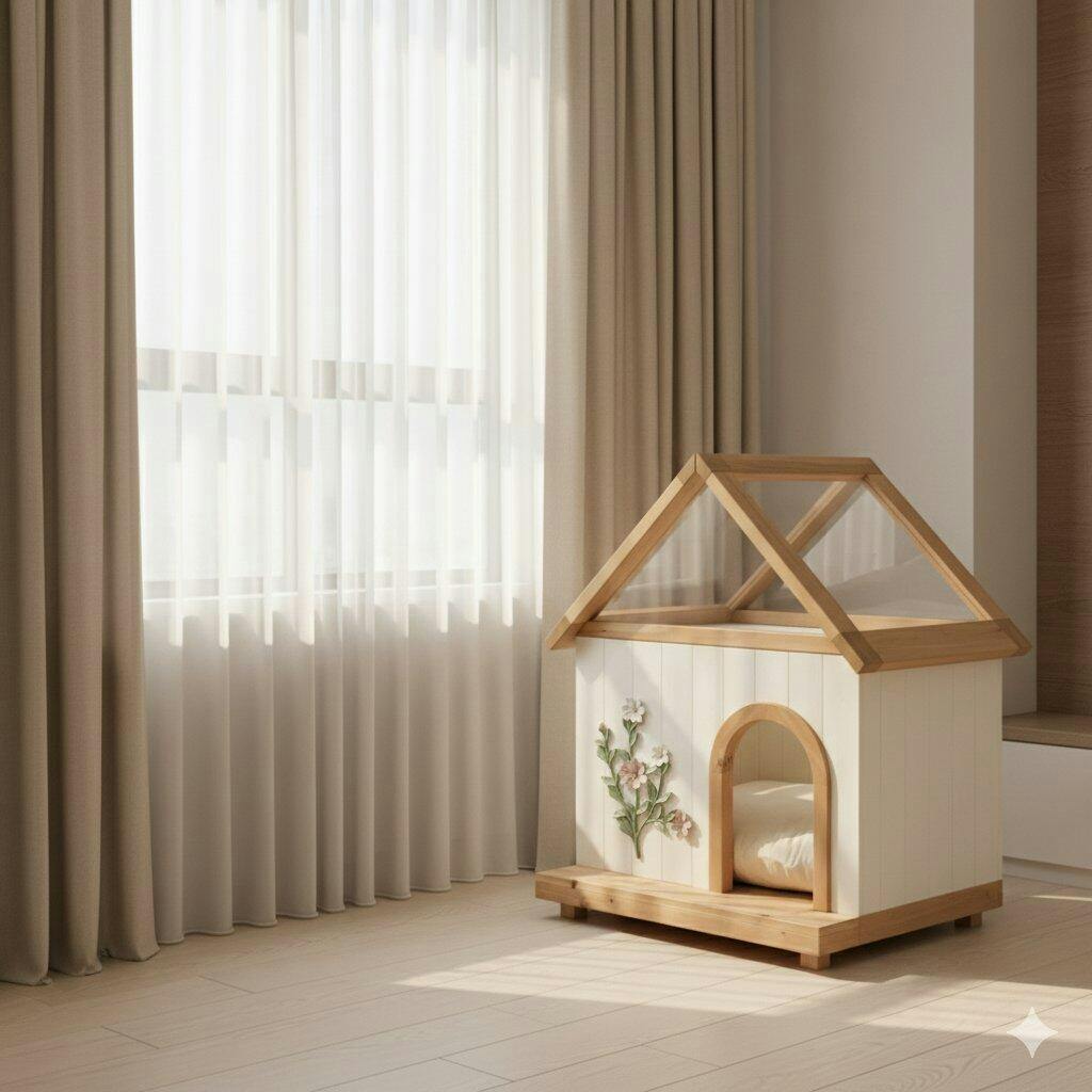 Wooden pet house with floral design on a light wooden floor with a plant and curtain in the background