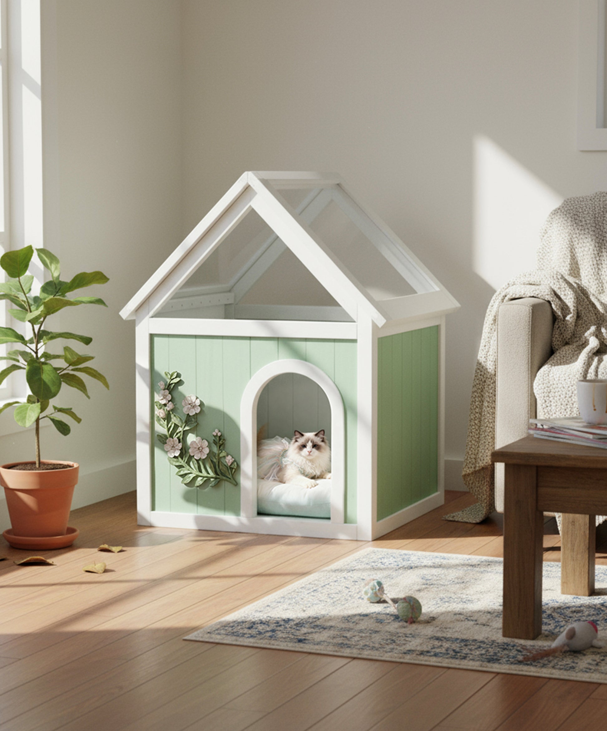 The clear acrylic roof allows ample sunlight to bathe your pet’s space, providing a cheerful atmosphere while allowing them to stay connected with their surroundings. This isn’t just a home for your pet—it’s a space of serenity, full of natural light and comfort.